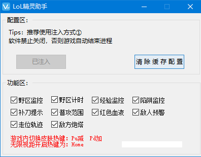 主要功能:特效换肤,无限视距,打野计时,打野侦测(全图无视野透视野怪死亡),炮塔范围,红色血液,经验监控,等等...