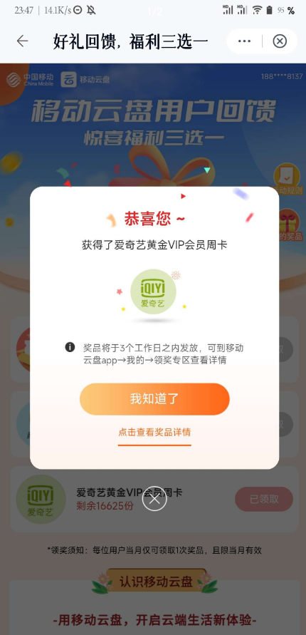 移动用户百分百领取腾讯视频 爱奇艺 周卡