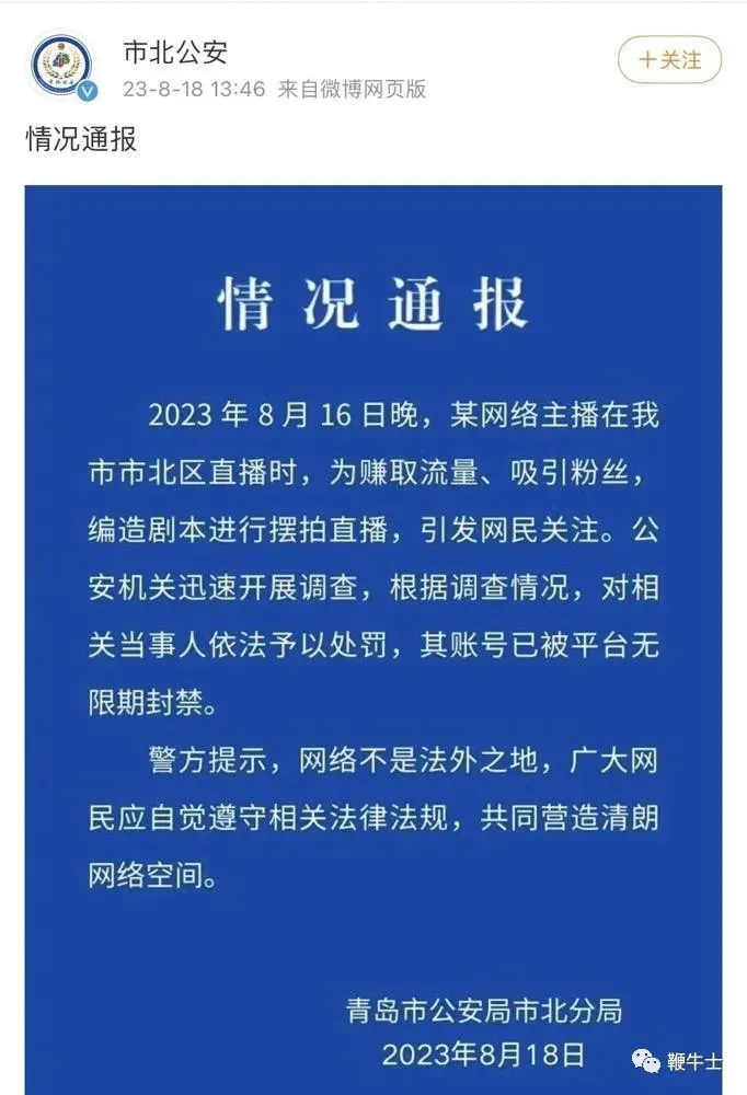 青岛市公安局今日也发出通报,「二驴的」为赚取流量, 编造剧本进行摆拍已经引起网友关注,造成了不良影响。目前已对其依法予以处罚,其账号已被平台无限期封禁。