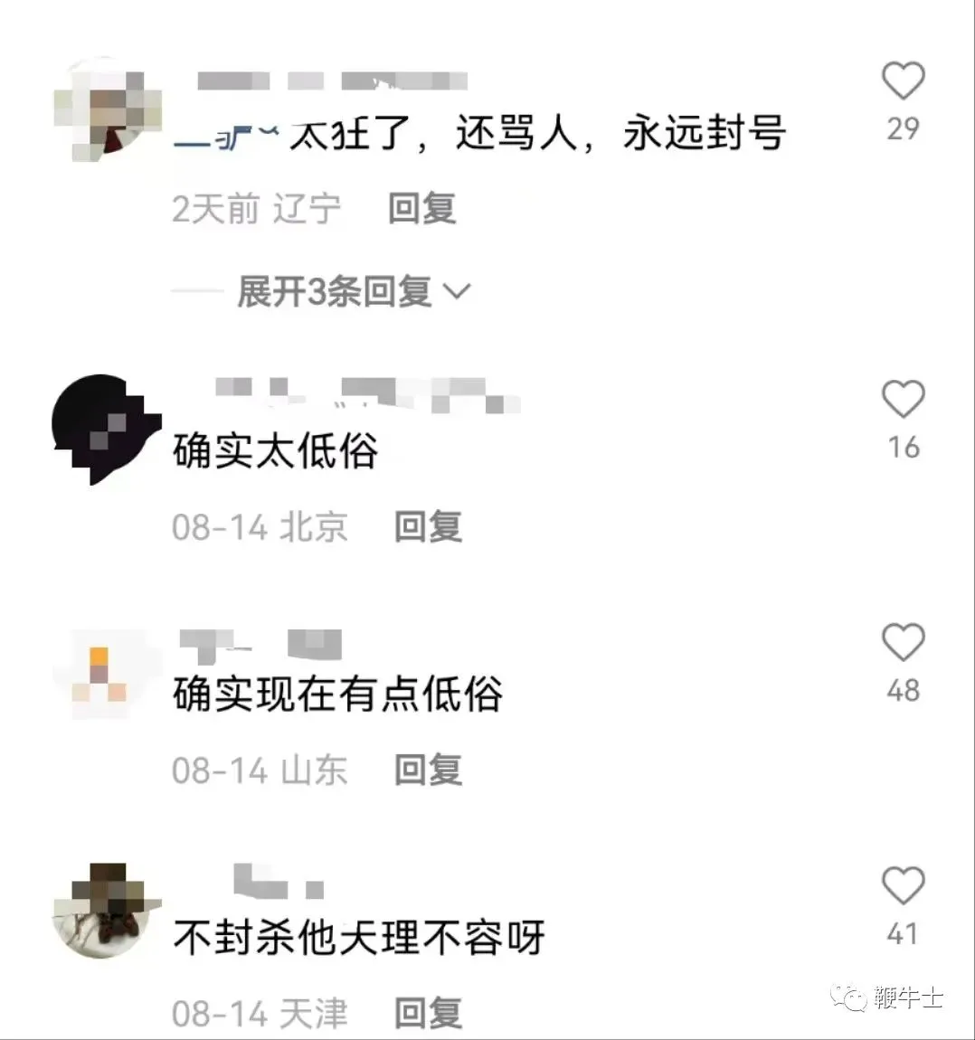 对于二驴账号被封,网上也有不同的声音。有网友称每天看他的直播确实很搞笑,但有更多的网友表示封的好、早该封了,「直播间随便骂人」「内容低俗」「在直播间炫富」等评论不断。