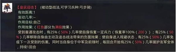 【垒实迎击】每回合拥有50%几率的援护效果,受到普通攻击时就有50%几率移除由主动战法、追击战法带来的“负面效果”,同时还有50%几率进入规避状态,免疫下一次伤害,50%几率能恢复自身一定兵力。