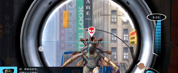 3、向上滑动滑块放大狙击镜,然后点击屏幕左侧瞄准那个外星人