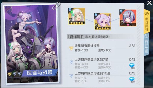羁绊:收集对应的探员解锁羁绊可获得钻石奖励以及属性奖励