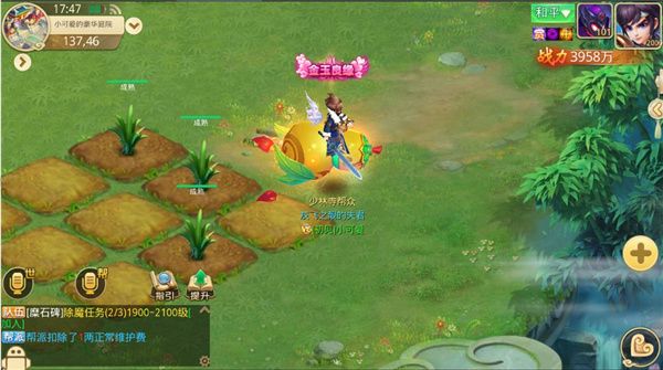 种植界面玩家可以种植作物获得铜币,有仙园精灵可以获得自动收成作物。
