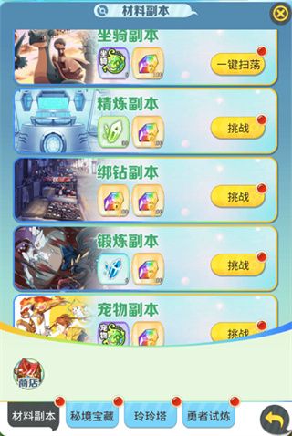 天天驯兽师的副本分为四大类,分别是材料副本、秘境宝藏、玲珑塔、勇者试炼。