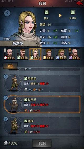 值得一提的就是这款游戏有非常棒的转职系统,根据人物的六维属性来评测这个人物该当什么职业,六维分别是:力量、体质、技巧、感知、敏捷、意志,每个属性的等级分为SS到E七个等阶,因此在考虑一个人物是否值得培养,适合当什么职业,属性值是个很好的参考标准。