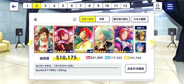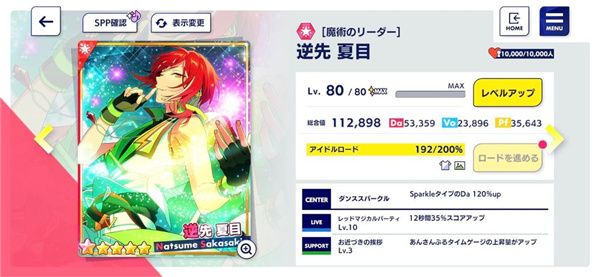 那我们所有队员就必须是「Sparkle类型」和「特化能力值为Da」的卡片,就出现以下组合:会发现队伍皆为Sparkle ,且最高特化值为Da ,这样所有队员都可以吃到夏目的队长技,且能力值最大化。而这就是「同特化能力」的组法。