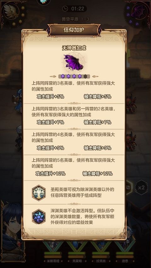上阵同阵营的3名英雄,可使友军获得强大的属性加成,如攻击提升+5%,被击降低+5%