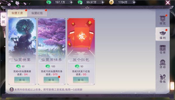 7、加入仙盟后,通过完成仙盟的一些任务,可以获得仙盟工资,玩家也可以通过仙盟红包发放一些红包扶持仙盟玩家,玩家完成特定的红包任务时自动获得红包,可选择发放。