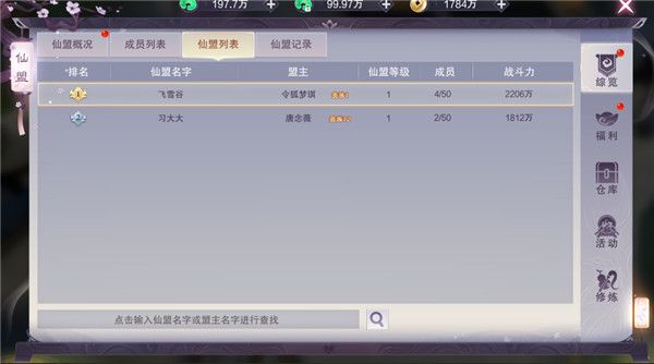 6、在仙盟中,可以查看成员的等级,战力等信息,也可以和其他成员私聊,而仙盟列表显示本服拥有的公会和他们的实力。