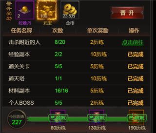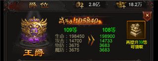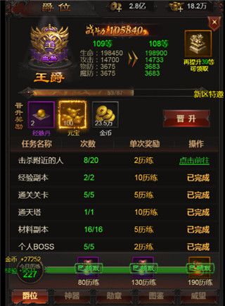 爵位可通过晋升以及提升官位来拥有奖励和增益。爵位晋升需要获取“历练值”,可通过完成每日任务获得,请积极完成日常吧,当历练点积攒到一定程度就可获得晋升机会,晋升可提升多种属性的同时,还可以获得元宝,金币和经脉丹等材料奖励。