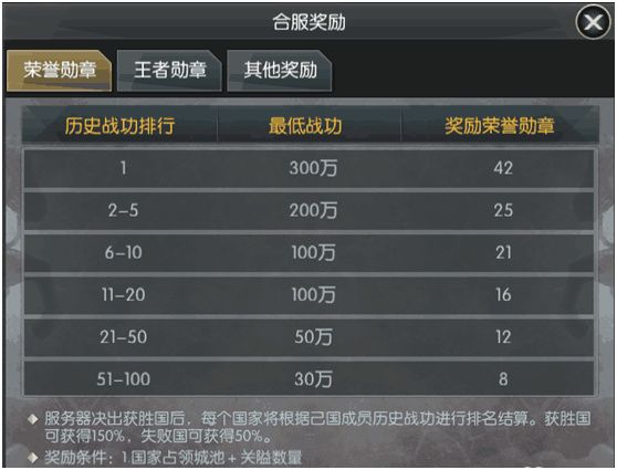 1、战胜国在当前服务器统一的时候会根据战功排行榜额外获得大量轮回勋章、王者勋章。