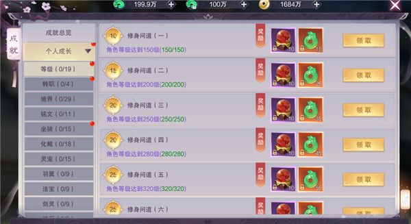 8、成就:玩家可以查看在游戏中获得的成就记录,并获得一些仙玉及物品奖励。
