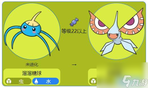 雨翅蛾由溜溜糖球进化而来,当溜溜糖球等级22以上即可进化为雨翅蛾。溜溜糖球的属性是虫系和水系,它有一个圆的蓝色身体,从身体上延伸出四条细长的腿。它也可以直接进化为蛾类,它的进化型叫做雨翅蛾,属性也变成了虫系和飞行系。