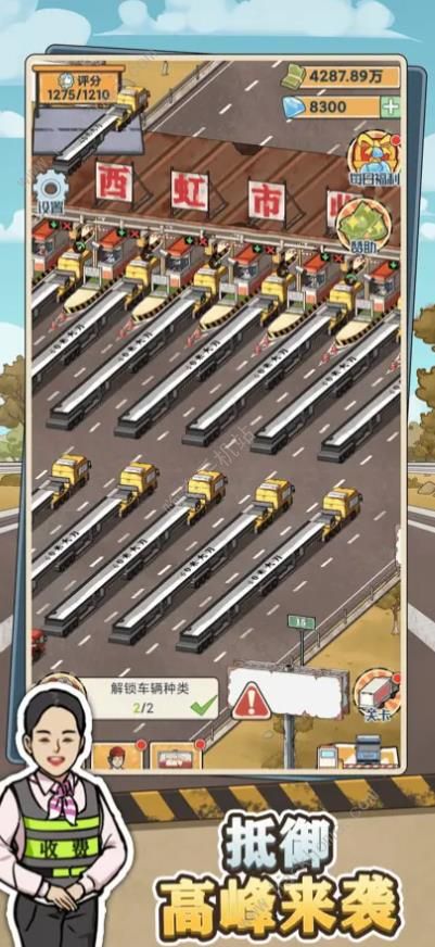 《高速收费站》是一款模拟高速收费站的游戏。玩家经营高速收费站,通过不断地升级设施、解锁更多车辆,将高速收费站一步步地发展壮大!