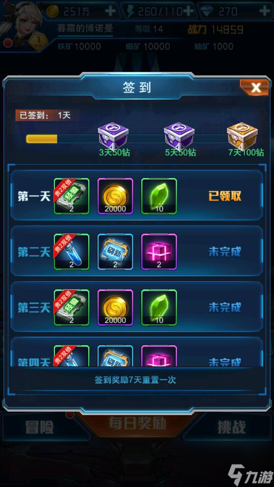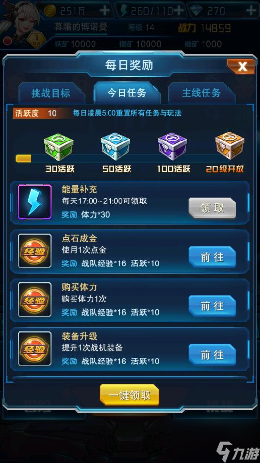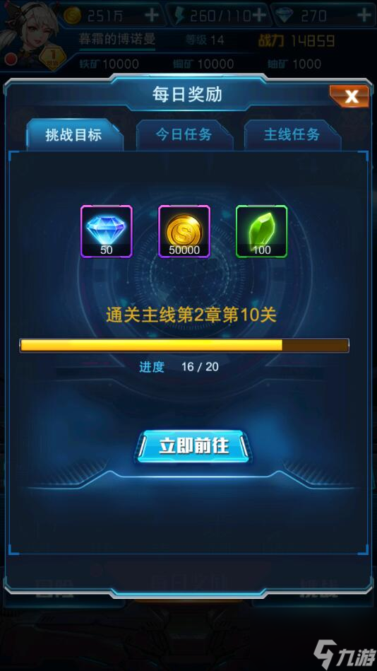 1、进入到每日奖励界面,如下图,完成通关主线任务可以获得钻石、金币和战机晶石奖励