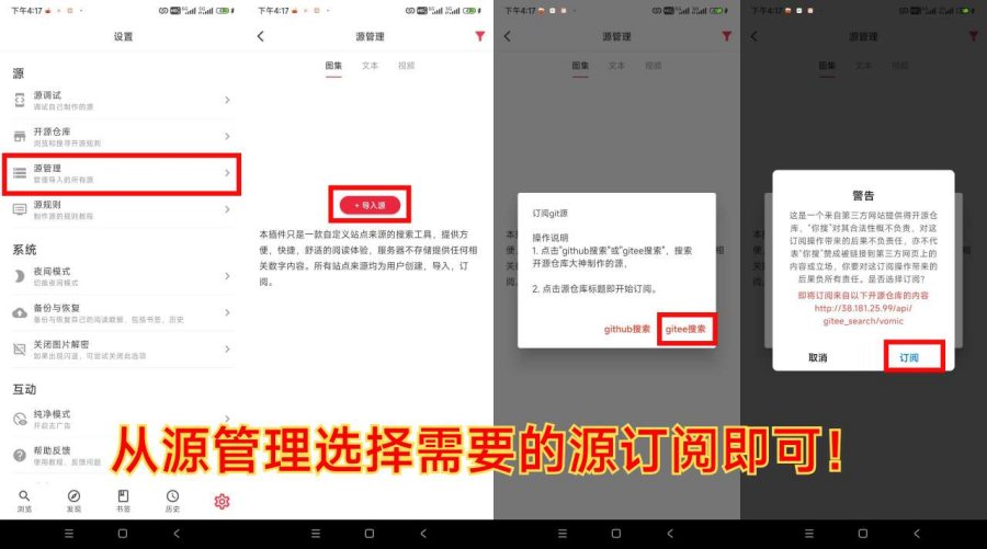 安装后先去设置的源管理,gitee导入小说漫画源,订阅你需要的源即可使用!